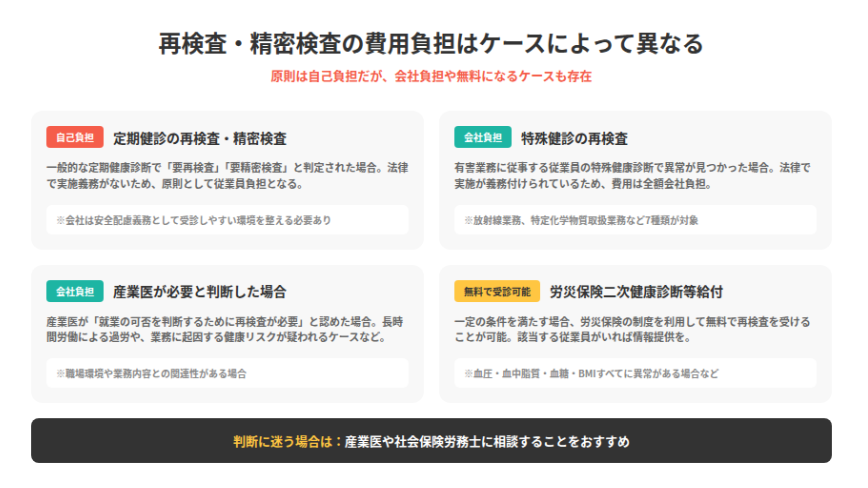 健康診断の結果、「要再検査」や「要精密検査」と判定された場合、その費用負担はどうなるのでしょうか。この点は多くの企業担当者が悩むポイントです。