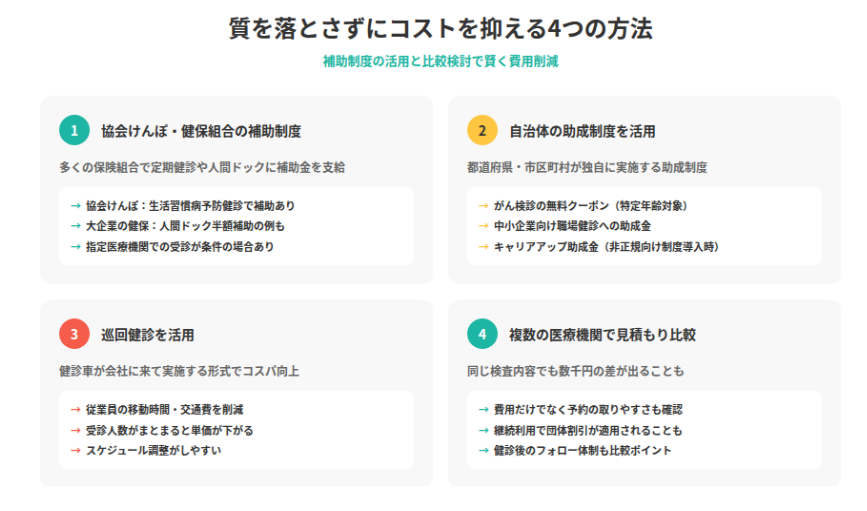 ここでは、健康診断の費用を抑えるための具体的な方法をご紹介します。