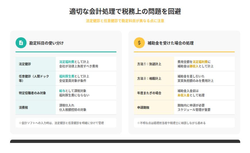 会計ソフトへの入力や仕訳処理の際は、法定健診と任意健診を明確に分けて管理することをおすすめします。年度末の決算や税務申告時にスムーズな対応が可能になるでしょう。